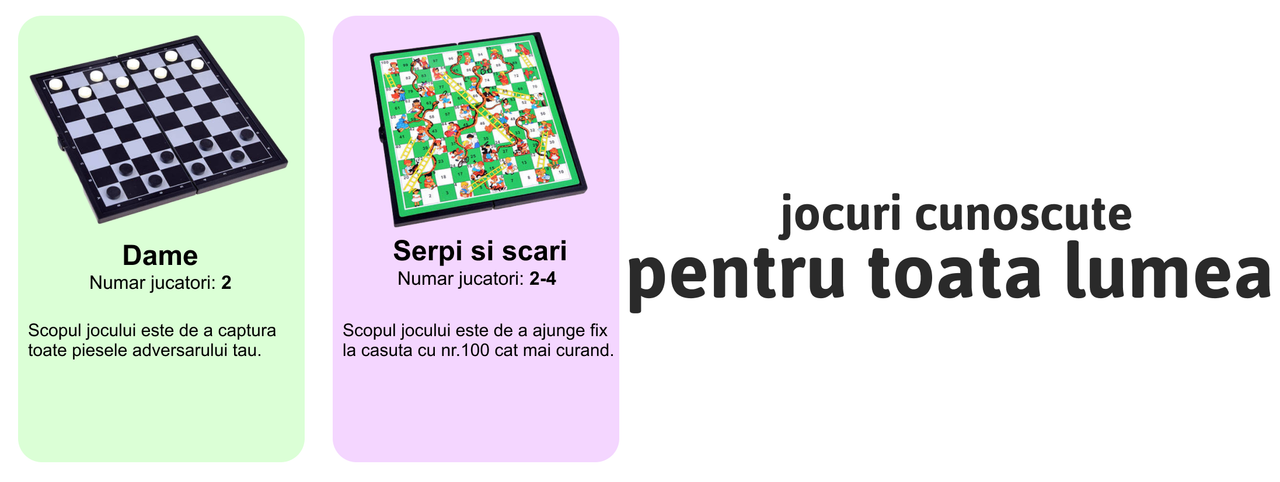 Jocuri pline de imaginatie gandite sa fie un sprijin in educatia copiilor, sa le aduca bucurii si sa le insufle un simt al respectarii regulilor avand in centru ideea jocului.